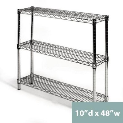 Need a dependable, durable storage solution for an area with a limited amount of vertical space? Low in height, our 21"d 2-tier chrome wire shelving keeps items organized in those tight spots where taller units won't fit. This product cannot be stacked. For taller shelving, please see our 3-shelf, 4-shelf, and 5-shelf units. Constructed of chrome-plated steel. Open design reduces dust accumulation. 21-48"w shelves hold up to 800 lbs, evenly distributed. 60/72"w shelves hold up to 500 lbs, evenly distributed. Made for indoor use, dry storage only. NSF approved. To securely set and easily release shelves, tap their corners with a rubber mallet.