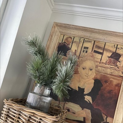 Add a touch of cheer to your home decor with this Shimmer Long-Needle Arrangement from Threshold™. This artificial arrangement features long pine needles in a frosted finish for wintry charm. Housed in a fluted glass jar with artificial water filler, this arrangement brings a nature-inspired look to the your space. Suitable for indoor use only, you can place it on a tabletop or any flat surface for a refreshing vibe.