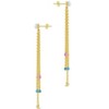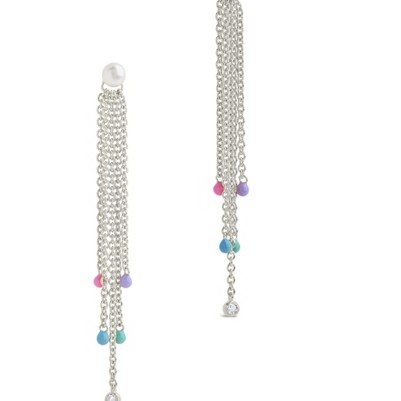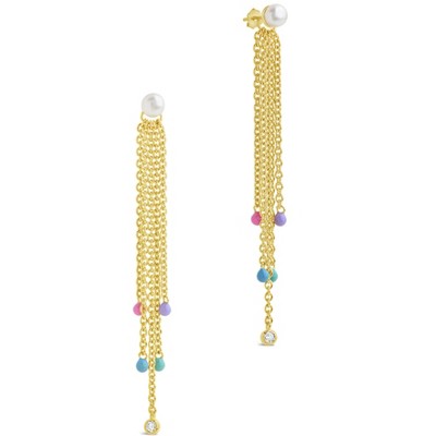 You'll want to wear these earrings every day! This pair of pearl post back dangle studs features a cascade of dainty gold chains with colorful stones on the ends. They're available in gold and silver tones.