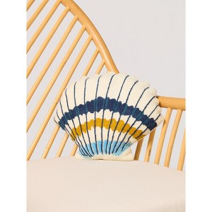 Bring a splash of coastal charm to your space with the Seashell Pillow. Designed in the shape of a scallop shell, this accent pillow features rich navy, golden mustard, and sea blue tones embroidered on a soft cream base. Its textured hooked surface adds depth and whimsy to your favorite chair, bench, or bed. Whether you're lakeside or just dreaming of it, this pillow captures seaside serenity in the most stylish way.