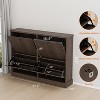 This sleek shoe cabinet combines functionality with style, featuring 4 flip compartments with adjustable and removable shelves to store up to 24 pairs of shoes. Its compact 47.2"W x 10"D size fits perfectly in smaller spaces like entryways or apartments. The flip-front design keeps shoes neatly hidden while being easily accessible, and its modern, minimalist style blends with any décor. Crafted with sturdy wood and reinforced with an anti-tip device for safety, it's perfect for households with children. Easy to assemble with included instructions, this cabinet is a practical and stylish addition to your home.