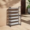 This versatile set includes two stackable 3-tier racks that can be used separately or combined into a 6-tier unit. Each shelf adjusts between flat and angled positions and supports up to 22 lbs, with 8.1" between tiers for tall boots. The 12.1" x 29.1" x 49.4" metal frame includes adjustable feet and an anti-tip kit for stability, organizing 18-24 pairs of shoes efficiently.