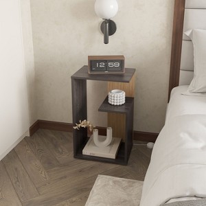 Vega Side Table in Melamine with Open Storage,Onix and White "Elegant and Versatile Side Table: Designed to complement any space, our side table is the perfect balance between functionality and style. With sturdy construction and a compact design, this piece is ideal for placement next to your sofa, bed, or armchair. It offers a practical surface for lamps, shoes, or your favorite books, along with additional space thanks to its shelves. Perfect for any room, from the living room to the bedroom, this table is not only a convenient place to store your daily essentials but also serves as a decorative focal point that enhances the aesthetics of your home. Dimensions of 24,9¡° (H) x 15,7¡± (W) x 11,8¡± (D)."