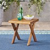 Offer small appetizers to house guests throughout the day using this outdoor side table. Crafted from acacia wood, this rustic-style table features a sandblast teak finish to protect it from the elements. Ideal for your backyard or patio, this side table includes a classic cross base for a simple yet effective set up.