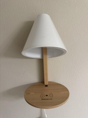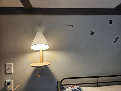 It’s a great alternative to having a full nightstand especially if there’s not a lot of room. The lamp works well with the small on and off switch on the table top. It charges my phone when it is perpendicular to the wall. I like that the cord is clear to help disguise it. I also like that it is hung on two screws. The only thing I did not really like was the wood. It’s laminated but you can see some imperfections like some seams and minor bubbling.