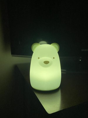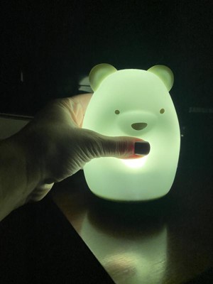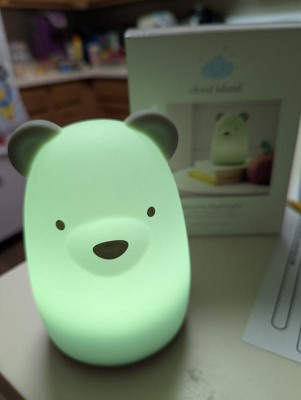 Create a beautifully glowing space with the Silicone Nightlight from Cloud Island™. This nightlight pack includes batteries, a gift box, and a nightlight. The green bear nightlight is designed with a nose and ears for a fun look. It features an adjustable design with a sleep timer and a base slide on/off switch for easy operation. Best of all, this LED nightlight has a two-way light setting to help customize the light level to their liking.