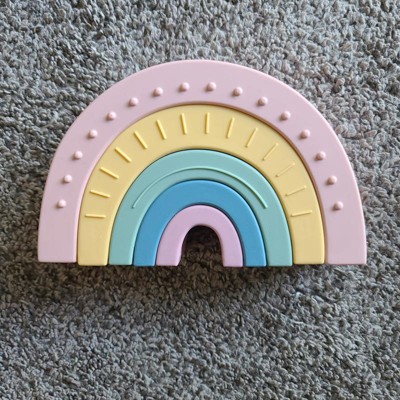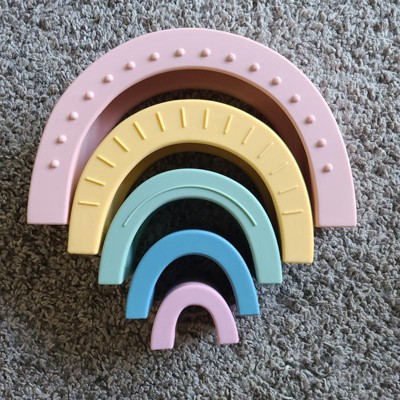 This rainbow stacker is a cute toy for toddlers. It is made of soft silicone that is easy on little hands. It is easy to clean. The colors are soft and the pieces fit together nicely. My little one loves playing with it.