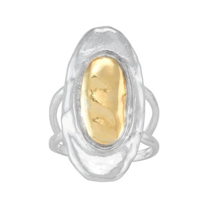 This statement ring features a brass centerpiece framed in sterling silver. The bold mix of metals highlights its sculptural design. Each detail reflects a balance of creativity. It has a compelling contrast in form and finish. The elongated oval shape boldly flatters your look. The piece comes with a “.925” sterling silver quality stamp. Nickel-free and hypoallergenic, this style comes beautifully presented in signature packaging.