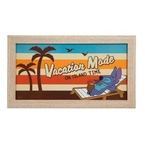 Get some island vibes in your décor with this wood wall art from Lilo & Stitch. Stitch is laying on a sun bed with a coconut drink with "Vacation mode on island time" above and palm trees, birds and stripes in the background.