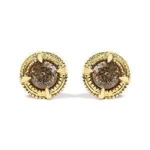 Elegant and timeless, these gorgeous tarnish-resistant 14K yellow gold-plated sterling silver stud earrings feature a pair of round brilliant-cut natural diamonds at their center. Graded K–L in color and I2–I3 in clarity, the diamonds display a warm brown tinge that creates a striking contrast against the rich yellow metal, adding depth and character to their sparkle. Each stone is framed by a raised double ring of milgrain detailing, reminiscent of delicate beads strung together, for a touch of vintage-inspired charm. The earrings have a high-shine polished finish and are designed with ultra-secure threaded posts and screw backs for comfortable, worry-free wear all day long. Perfect for daytime glamour or evening sparkle, these versatile studs pair beautifully with a favorite diamond necklace or other fine jewelry for a complete, sophisticated look.