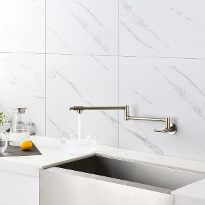 This silver wall-mounted rotatable folding faucet is crafted with a modern minimalist design, featuring a sleek silver metal texture that complements a variety of contemporary kitchen d�cors, adding a touch of elegance to the space. It is conveniently installed on the wall, which not only saves countertop space but also simplifies cleaning and contributes to a tidier kitchen environment. The faucet is made from premium solid brass with a chrome-plated finish for corrosion resistance and long-lasting durability. Functionally, it boasts a rotatable design for easy adjustment of the water flow direction, catering to diverse washing requirements, and a folding feature that conserves space and is convenient for storage and use. The user experience is enhanced with a straightforward operation system, featuring a double handle switch design for effortless control f the water flow, making it an ideal choice for kitchen sinks to fulfill everyday washing tasks.