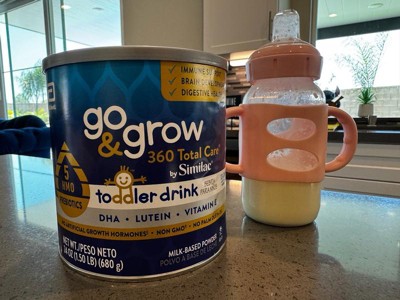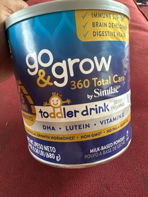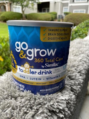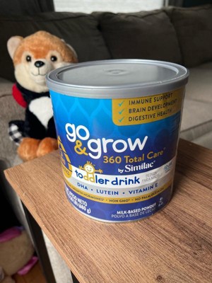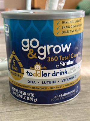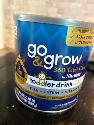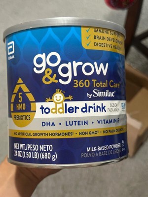 Go & Grow 360 Total Care by Similac* is the first US toddler nutritional drink with 5 HMOs. HMO prebiotics support digestive health and feed good bacteria in the gut, where 70% of the immune system exists. Two servings† have 28 key nutrients to support growth and development . Go & Grow 360 Total Care has our exclusive blend of DHA for brain and eye development, lutein to support eye health, and vitamin E to support developing cells. It has no artificial growth hormones‡ and is non-GMO.§ Designed for toddlers ages 12-36 months old. * Not for children with galactosemia. † 1 serving is defined as 15g powder mixed into 4 fl oz of water. ‡ No significant difference has been shown between milk derived from rbST-treated and non-rbST-treated cows. § Ingredients not genetically engineered. || Go & Grow Toddler Drinks are not for sole source nutrition.