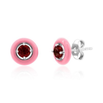 Simona Sterling Silver Enamel & Gemstone Halo Studs - Garnet - Available Colors: Red,