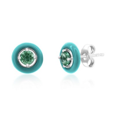 Product Name: Simona Sterling Silver Enamel & Gemstone Halo Studs - Green Agate - Green - gree, agate, stud earrings, enamel, gemstone