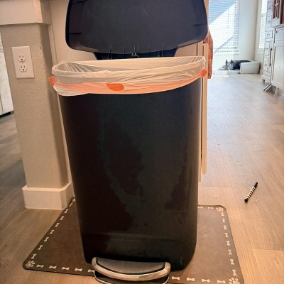 We quite enjoy this trash can! My I’m coming favorite thing about it is that the lid locks! One of our kiddos likes to push the trash over so being able to lock it has helped us with a lot of cleanup time. My biggest grievance with it is that it has to be pushed up up against the wall otherwise it tips over really easy which is super annoying but other than that, I really like everything about it I would buy it again! I do wish it was a little cheaper. Blows my mind how pricey trash cans are!