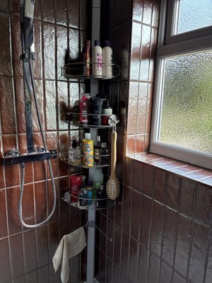 I needed a place to put all my stuff but really didn’t want to be drilling anywhere. A friend recommended this to me and it’s perfect. I have quite high ceilings and it fits really well. Simple to put together and very sturdy in place. I had one in my wet room for a while and then bought a second for the bathroom shower cubicle. It is quite big so wouldn’t recommend for very small spaces. I particularly like the razor holder and the arms which are great for shower cap and wash net. It’s easy to move out of the way for cleaning. I’ve had the one in the wet room for three years and there is no sign of rust or any deterioration in quality.