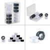 Includes three sets of class 15J bobbins in black and white, including 18 black pre-threaded bobbins and 18 white pre-threaded bobbins totaling 1,800 yards of 100% spun polyester thread, each set of 12 comes in its own clear plastic storage case
