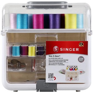 The Singer Sew-It-Goes is the perfect portable sewing box for projects on the go or at home. This portable sewing storage system features an easy open handle and locking latch for easy transport. Holds 40+ spools of thread and other essential sewing supplies for all your sewing projects. The customizable sewing storage with three convenient removable drawers can be arranged to fit your workspace. This package includes 18 large assorted thread spools (150 yards each), 24 small spools (25 yards each) in coordinating colors, 5.5 inch comfort grip craft scissors, basic seam ripper, mini tomato pin cushion, 60 inch vinyl tape measure, 100 dressmaker pins, 15 safety pins, 30 assorted hand needles in compact, metal thimble and needle threader, 12 replacement shirt buttons and 14 assorted fasteners. Imported.