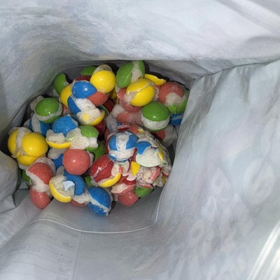 These “freeze-dried sour Skittles” look nothing like true freeze-dried candy. Instead of being light, crispy, and puffed, they’re completely clumped together and smashed. The pieces look crushed or melted, as if they were stepped on or compressed while soft, rather than dried. They aren’t airy or crunchy—more like a sticky, compacted lump of broken Skittles than an actual freeze-dried product.