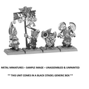 This multipart metal kit builds four command miniatures for Dwarf Slayers.