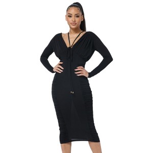 A: The dress has long sleeves that offer both coverage and a chic, stylish look.