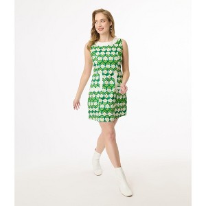 This fun and flirty woven 1960s dress features a vibrant custom daisy print throughout a bright green background, perfect for adding a pop of color to your wardrobe. The white contrast detailing adds a fresh touch, while the back zipper makes it easy to slip on and off. With front patch pockets for added convenience and sleeveless design with a flattering scoop neck, this dress is both stylish and practical.