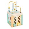 The Pastel Activity Cube will instantly become your toddler's favorite toy! Beautifully crafted with sturdy wood construction, pastel colors, and cute animal motifs, this motor activity cube is an absolute eye-catcher in the nursery. This classic 5-sided interactive toy includes a bead maze, sorting game, shape-fitting and pushing game, and gears. Help promote shape and color recognition, hand-eye coordination and problem solving skills. Lid is removable and reduces the height of the toy by half by simply turning over. Activity Center measures 7.5" x 6.5" x 7.1".
