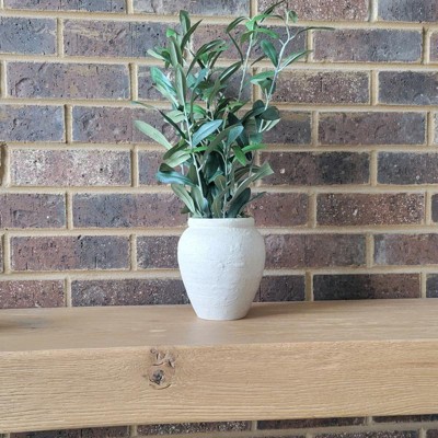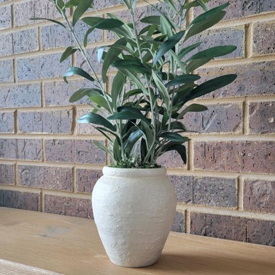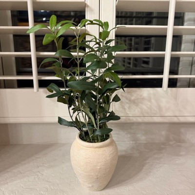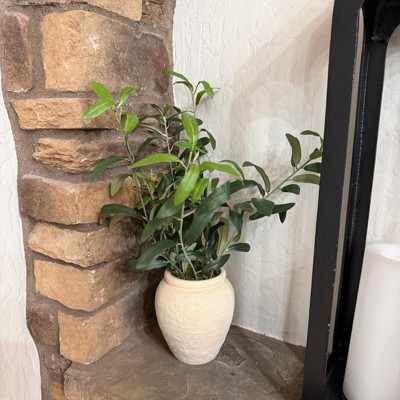 [This review was collected as part of a promotion.] This is a super faux olive plant by Threshold that adds a little touch of the Mediterranean to your home. The vase is really neutral and it fits easily into most decor schemes and rooms. I love its simplicity. Sturdy and made well it is easily placed on a windowsill. It is approximately 17 inches high.
