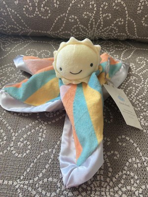 Such a sweet lovey! The smiling sun is so happy. And it’s truly gender-neutral — the perfect baby shower gift! The silk along the edges is a great change of texture for baby and it’s so very soft. The colors are more pastel than my picture.