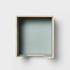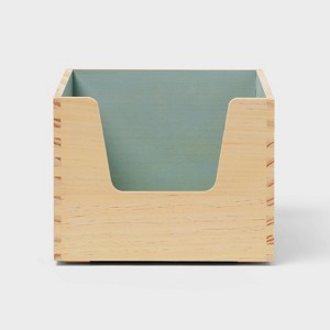 This Small Stackable Wood Storage Bin from Pillowfort™ makes it easy for your kid to keep their toys, books and stuffed animals organized. Made from wood, this square storage bin is designed with an open top and a cutout at the front so they can easily see what they've stashed inside. It features a natural-color exterior with a smoke green interior for easy integration into their room's existing decor aesthetic, and it boasts a stackable design to help save space.