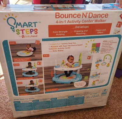 The Smart Steps by Baby Trend Bounce N' Dance 4-in-1 Activity Center Walker offers playtime fun through learning! This exciting walker is equipped with unique, removable standalone toys that can be taken and played with on-the-go. When little one doesn't want to walk, quickly convert to stationary activity center mode with our innovative Tuck-in Wheels. Keep the fun going with the Tippy Tap Dance Board which makes sounds when pressed. This board fits on to the bottom of the walker and can also be used on its own for tummy-time fun!
