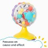 We just got this for my daughter and she loves the colors and spinning each side independently! The space scene is lovely and the confetti stars inside really top it off! The suctions cup is super strong, and you don’t have to worry about the toy going anywhere! The only thing I would change is the bottom rotating so kids can go between sides.