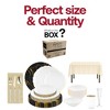 Host unforgettable celebrations with this banquet-size disposable dinnerware set for 100 guests, featuring striking black charger plates with gold trim, clear dinner and salad plates accented in gold, and elegant white soup bowls with gold detail. The set includes gold-and-white flatware, clear tumblers, champagne flutes, ivory napkins, and ivory tablecloths for a perfectly coordinated upscale look. Made from durable BPA-free plastic, this collection is strong enough for multi-course meals while offering the ease of single-use cleanup. Ideal for weddings, anniversaries, corporate events, and formal banquets, it combines timeless black-and-gold elegance with practical convenience.