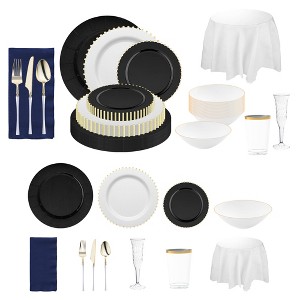 Elevate large gatherings with this service for 100 dinnerware set in black, white, and gold accents, designed for weddings, banquets, and elegant celebrations. Featuring black charger plates, white dinner plates with gold trim, black and gold salad plates, and silver-accented soup bowls, this set delivers a refined dining experience. Coordinated with gold-and-white flatware, navy napkins, white tablecloths, clear cups with gold trim, and champagne flutes, it combines premium style with disposable convenience. BPA-free plastic ensures durability and effortless cleanup after your event.