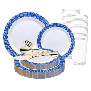 Shop our White with Gold Spiral on Blue Rim Plastic Wedding Set. With large quantity selections, this set offers a classy, affordable way to wow guests.