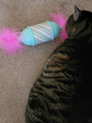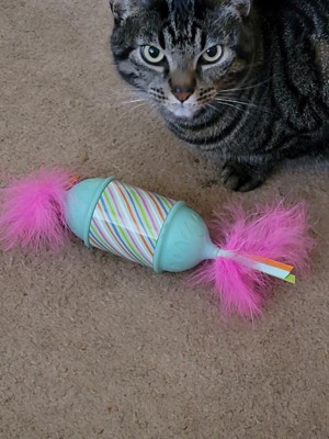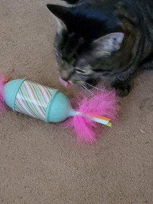 [This review was collected as part of a promotion.] My cats have enjoyed playing with this new toy. It is in the shape candy, and it rolls on its own. It has kept my cats entertained for hours. My only complaint is that the feathers can fall off after some wear and tear but the toy itself is great. I love it and so do my cats