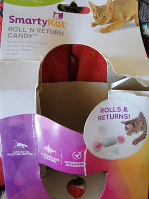 [This review was collected as part of a promotion.] The SmartyKat Roll 'N Return Candy's fun for my cats. You place it on the floor and gently roll it and it will roll right back to you with no batteries needed. The cats hunt for this toy to attack it.