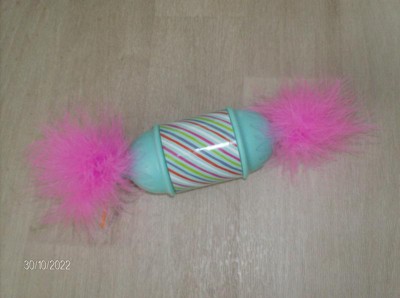 The SmartyKat Roll N Return Candy toy offers an engaging play experience for cats, featuring a unique design that rolls back to them after being pushed. Many guests appreciate its interactive nature, which keeps their pets entertained for hours. The colorful feathers and ribbons add visual appeal, making it a fun addition to any cat toy collection. However, some guests noted that it performs best on hard surfaces and may not hold the interest of all cats.