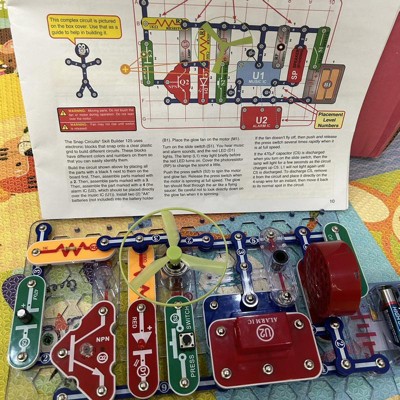 Snap Circuits® are the buildable, playable kits that invite kids to make dozens of cool electronic gadgets, games, and more! This Snap Circuits® Skill Builder kit mashes up tech with toys, so kids can make tons of things, like a glow-in-the-dark flying saucer, an Auto-Off Daylight switch, an Electron Warehouse, a Dancing Motor, a Siren Changer, a Lighted Tripwire Alarm, and more! You can also build the Super Circuit, exclusive to Skill Builder 125 – with music, alarm sounds, LED lights, and the glowing flying saucer all in one circuit!