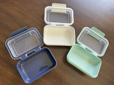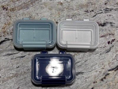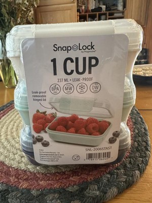 Snap lock 1 cup set is conveniently coming with 3 containers of the colors, navy, cream and light green. The lid is attached to the bottom container, so you never loose the set apart!! The lid is tightly sealed and secured so the liquid in the container will not leak!! They are dish washer safe and microwave safe, so they are very useful in our daily life!!