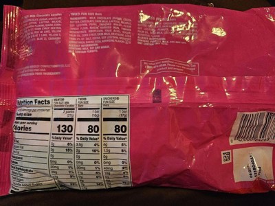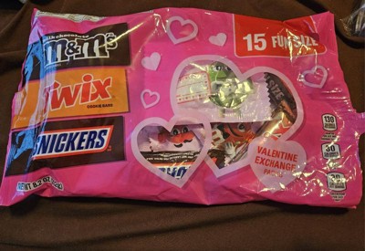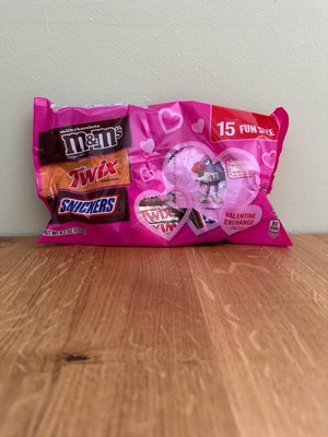 [This review was collected as part of a promotion.] The 15 count M&M's/Mars Valentine candy bag is so cute! I really love that the M&M packs have a little Valentine on the back - it's cute for kids or even adults! The Snickers and Twix are fun size, also. The chocolate treats are the same taste that we all know and love. Overall, this is a fun idea, especially for kids classrooms or even the office!