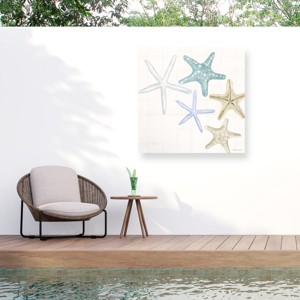 This ready to hang, gallery-wrapped art piece features a painterly depiction of starfish.Prominent Colors: White, Light BlueWild Apple Portfolio Photography showcases the collaborative efforts of our talented and creative designers and art directors. Using found objects, documents, photography and vintage art, the work of our studio addresses current design trends. Our designers are Laurie Chester, Gretchen Gray Buchanan, Moira Hershey, Mike Schick, Sue Schlabach, Laura Marshall, Sarah Adams and Mary Urban.The Outdoor Canvas Art by Trademark Fine Art is a great way to add a pop of color to your poolside, balcony, backyard, garden, or porch. This all-weather outdoor decor is printed with UV gel inks to prevent fading for years to come. These colorful outdoor pictures for the patio have been digitally reproduced, printed on all-weather artist canvas, stretched, and gallery wrapped on all-season stretcher bars for a clean finish.