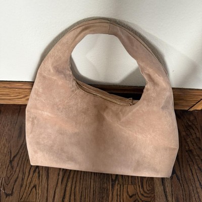 Surprisingly nice bag. The “suede” has a good feel and a great chocolate color. There’s plenty of room inside and the handle is perfect for on the shoulder or on your arm. I especially appreciate the handle in the same fabric as the bag. All in all, a great fall and winter bag in a very trendy color.
