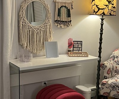 A great quality/more affordable option to the acrylic waterfall console tables that run well over $300. This was perfect in a guest room that I was looking for a very minimal desk/make up table.