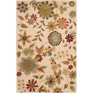 Enhance your living space with the timeless charm of our hand-tufted wool and viscose area rug. Expertly crafted in India, this small rectangle rug measures a versatile 3 feet 6 inches by 5 feet 6 inches, making it a perfect fit for a variety of spaces. The ivory base serves as a canvas for a beautiful floral pattern that blooms in shades of sage and a variety of other complementary hues. Its botanical design exudes a natural elegance that will elevate the aesthetic of any room.