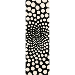 The black and ivory colors create a bold contrast that stands out in any hallway or long space, while the eye-catching pattern features an array of ivory dots that radiate in a dynamic circular design, giving the illusion of movement and depth. This striking pattern ensures that the rug not only serves as a practical addition to your home but also acts as a centerpiece for your decor.