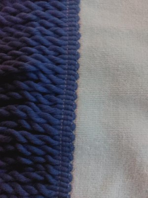 I wish there was a design on it. The bottom fringe feels like a rug because it is thick yarn. The towel is made from a good material that holds up and last long. I like the color of the towel and how it is different shades of blue. It reminds me of Branch from the Trolls. One side of the beach towel (like most) is soft and the other side is slightly rougher.