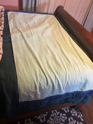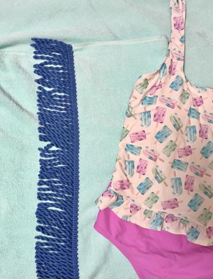 I was in need of some new beach towels for my upcoming birthday trip to Daytona Beach in Florida this October. This is a nice large size solid color teal blue with royal blue tassle fringe hanging off the edges of this beach towel.