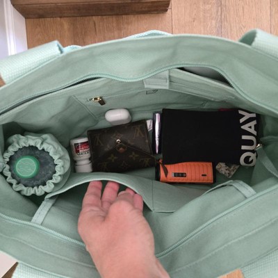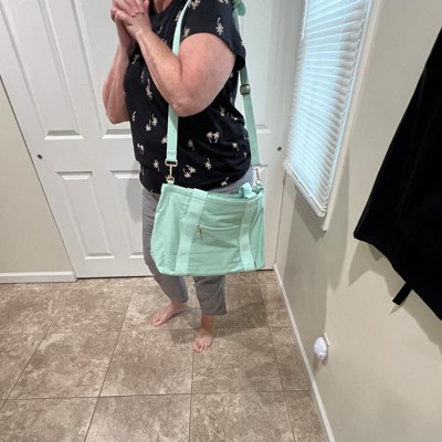 [This review was collected as part of a promotion.] I purchased this tote bag online. I love the color of this bag! It's a great bag to carry around for summer. It holds a ton and I can use it for an every day bag, or fill it up for a day at the pool or the beach. There are lots of compartments and pockets, including a pocket to hold my water bottle. The material is like a vinyl type canvas that's easy to wipe clean if it gets a little dirty. It can be worn as a shoulder bag or as a crossbody. The long strap is detachable. Great price for a beautiful bag! I received an incentive to write this review.