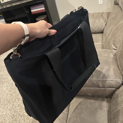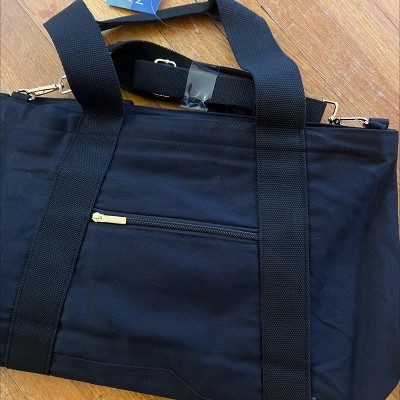 - Solid-color tote bag with laptop pocket
